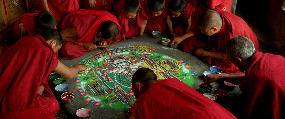 One striking scene in the film shows a group of Buddhist Monks painstakingly building a sand mandala. Mandalas have huge spiritual significance in Eastern religions with the word itself roughly translating to “circle”. The shot lingers for a long time on the intricate detail of the mandala and extreme close-ups almost show individual grains of sand being placed to form part of the brilliant whole. Later in the film, we return to find the Monks destroying the beautifully symmetrical work that they had evidently put so much time into. Once again, we see the idea that what is created must be destroyed to maintain the cyclical harmony of nature.